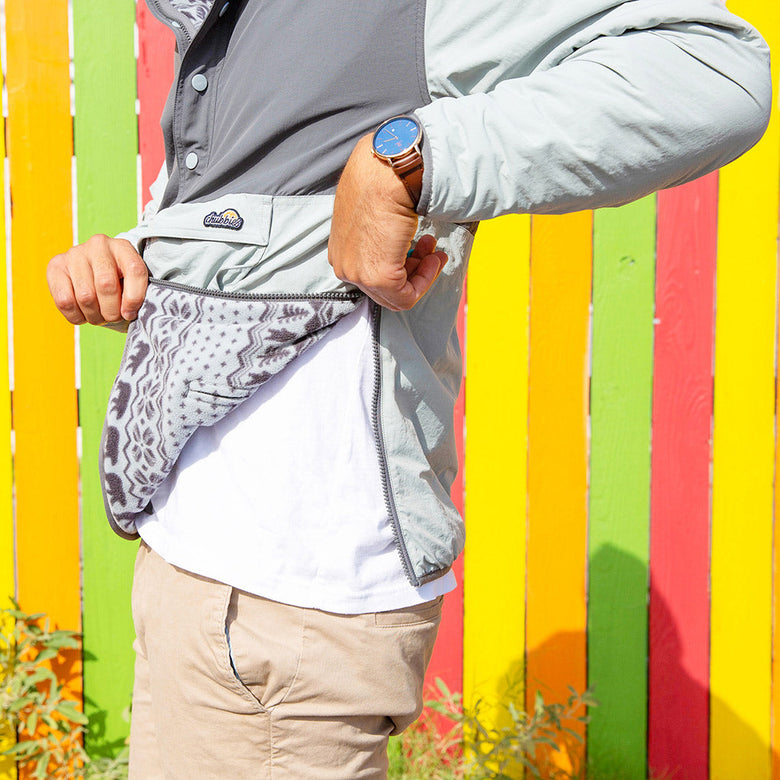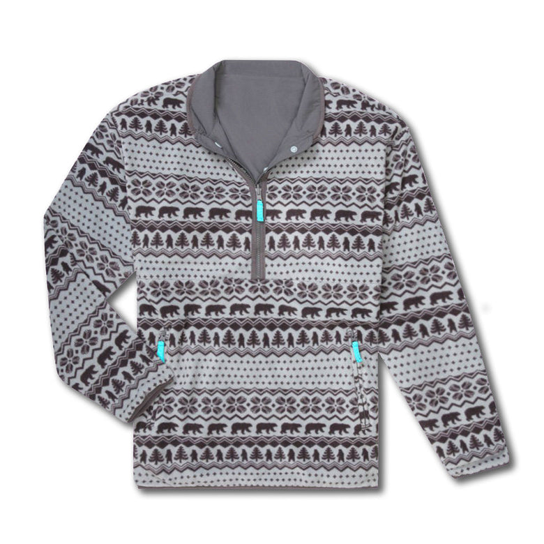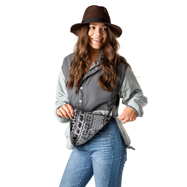 2 front zipper pockets on fleece side. 1/4 Zip style with YKK zippers and extra snaps for ultimate warmth on the windbreaker side.