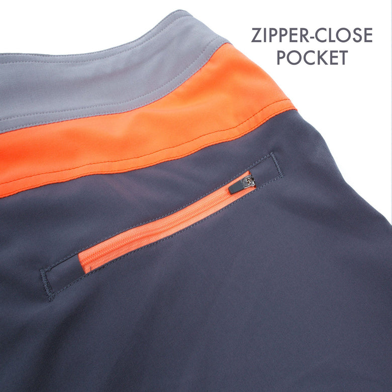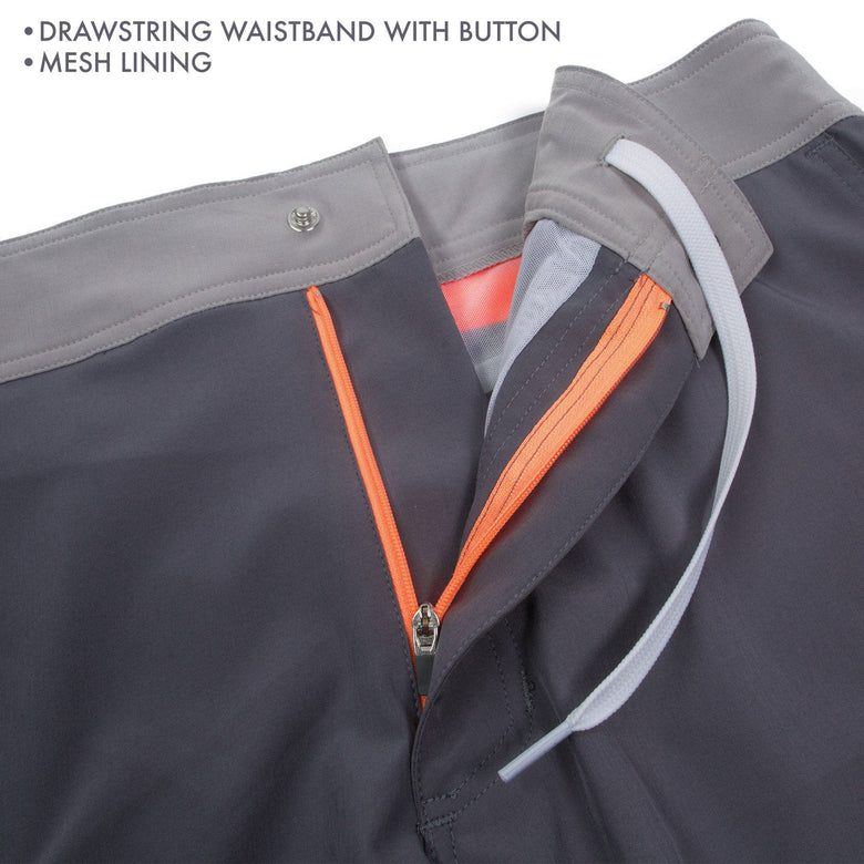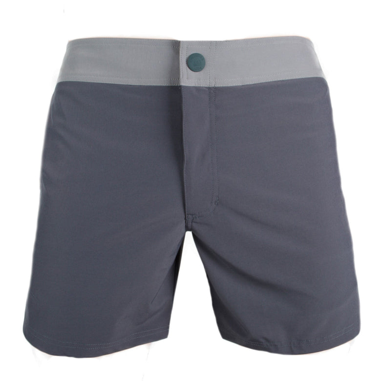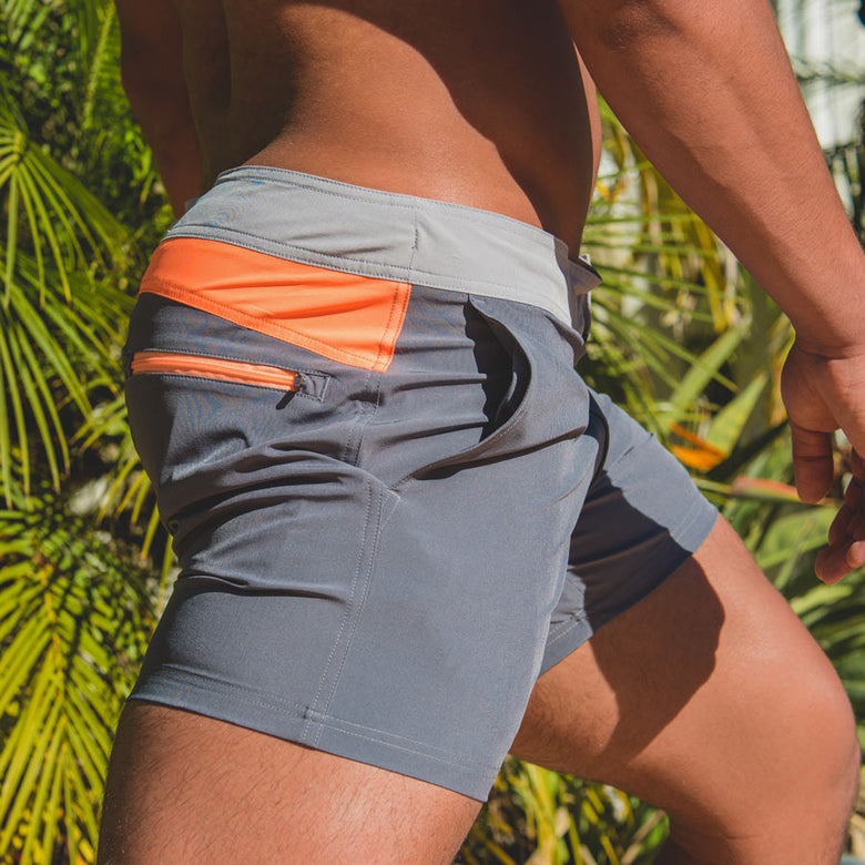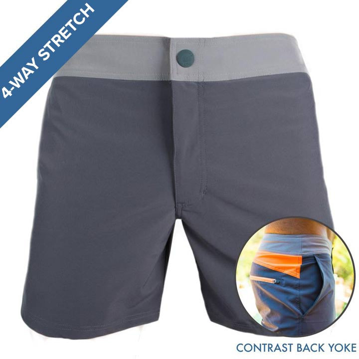 Feast your eyes on our performance swim trunks. They're made with 4-way stretch fabric, plus they also got a drawstring waist and button closure, which if I'm being honest with you guys, is really, really nice. If you're in between sizes, we recommend sizing down.