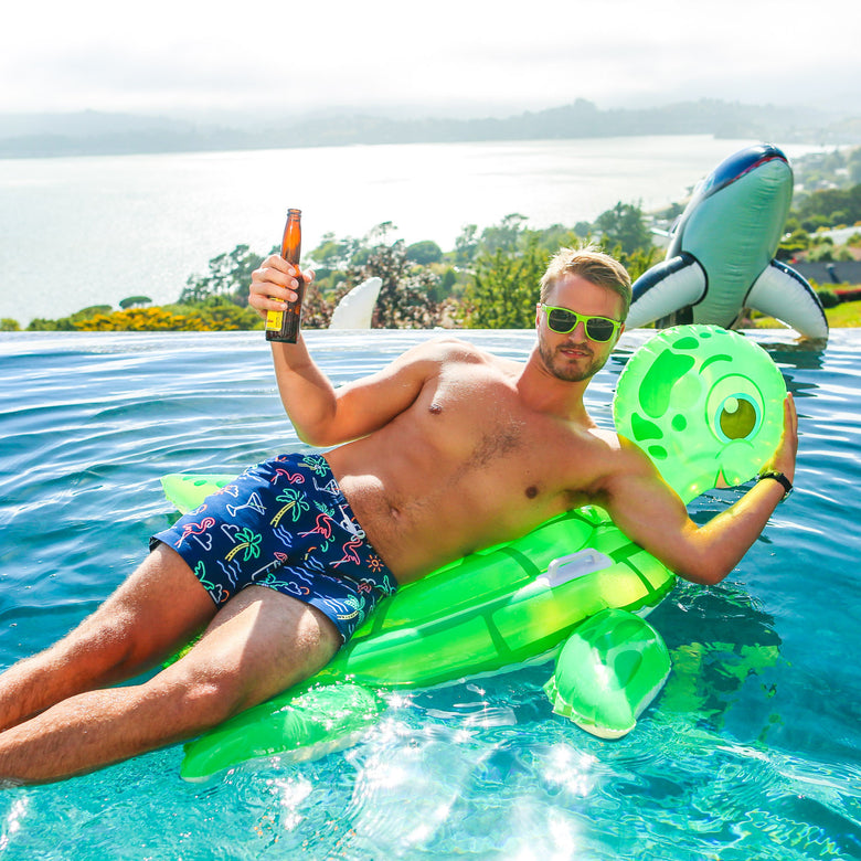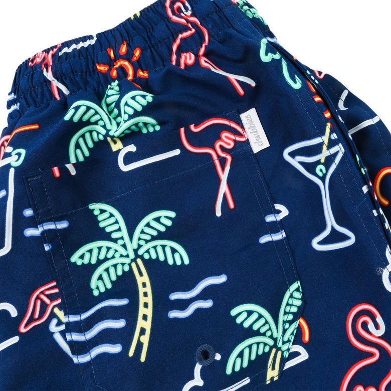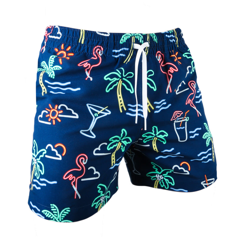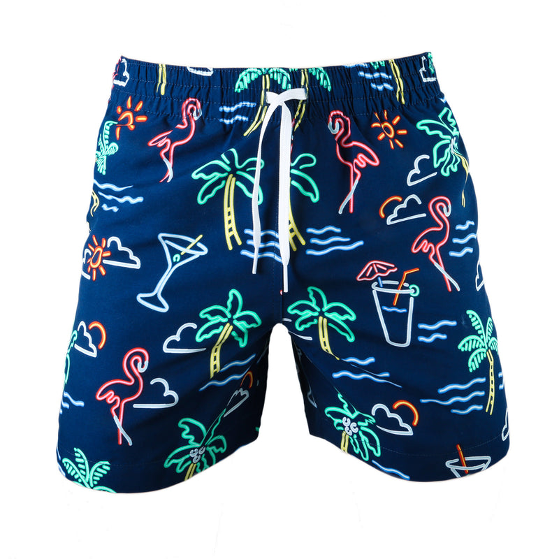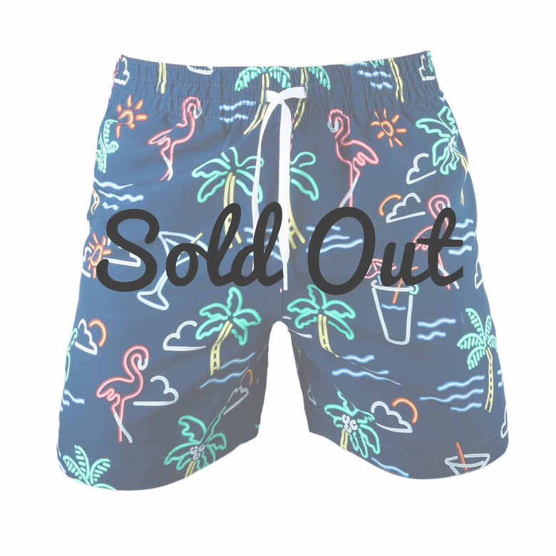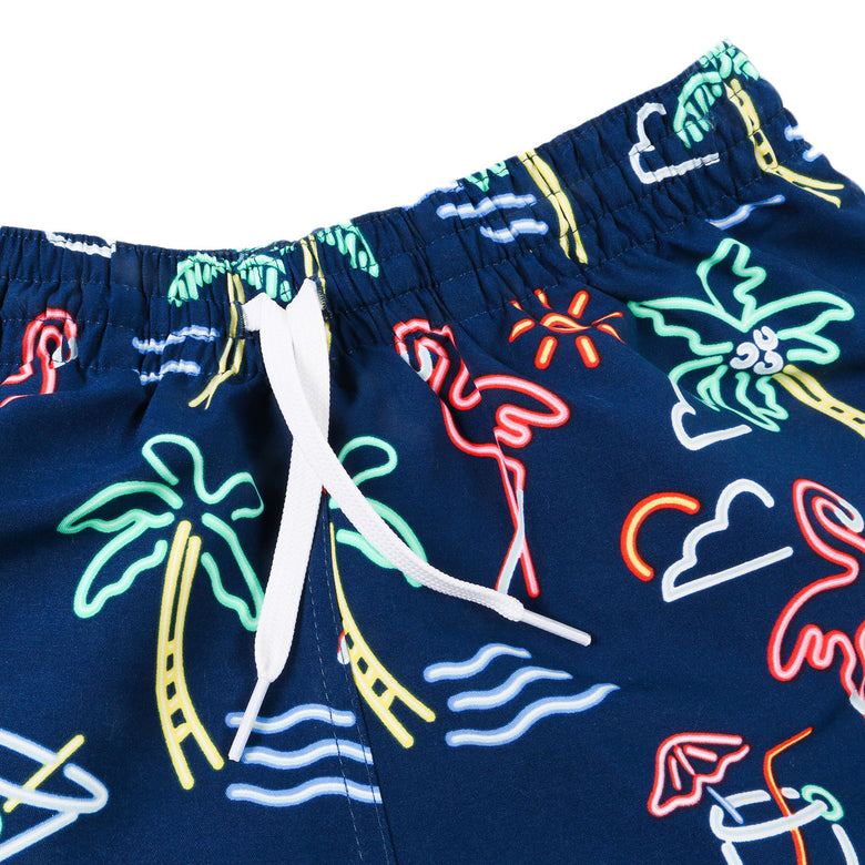 Materials: Made out of 100% Polyester. Navy trunk with neon light pattern.