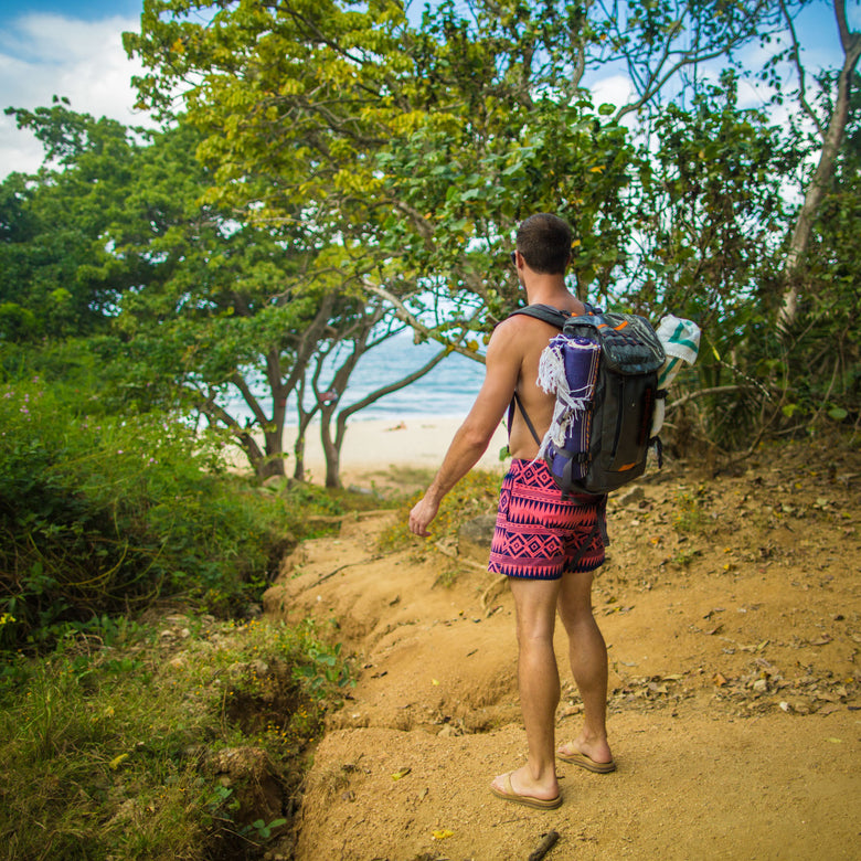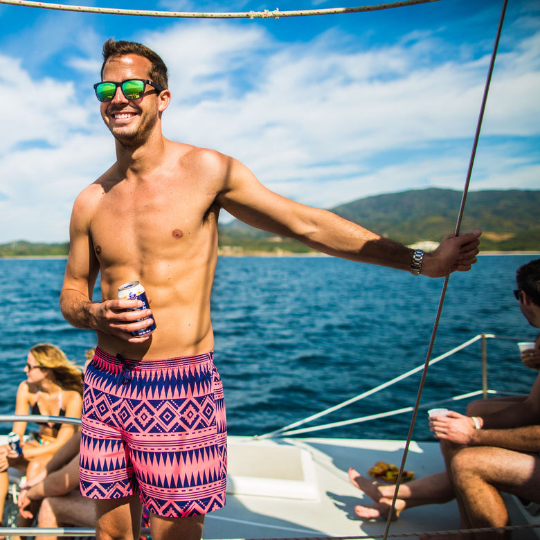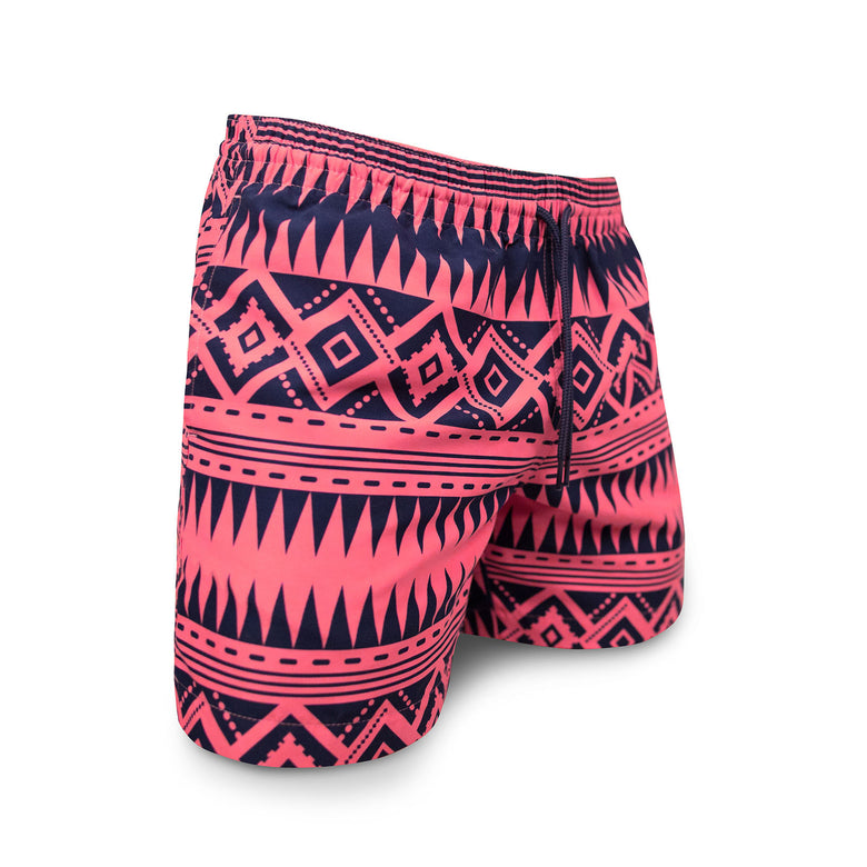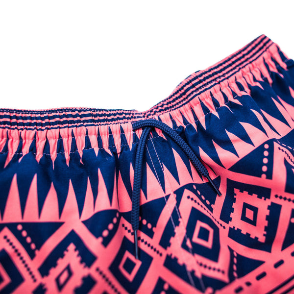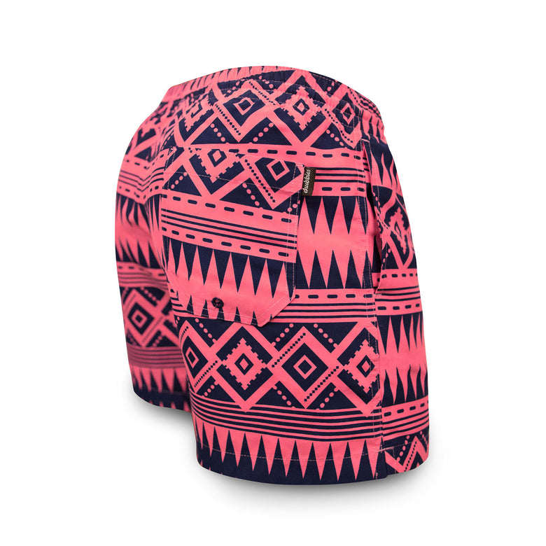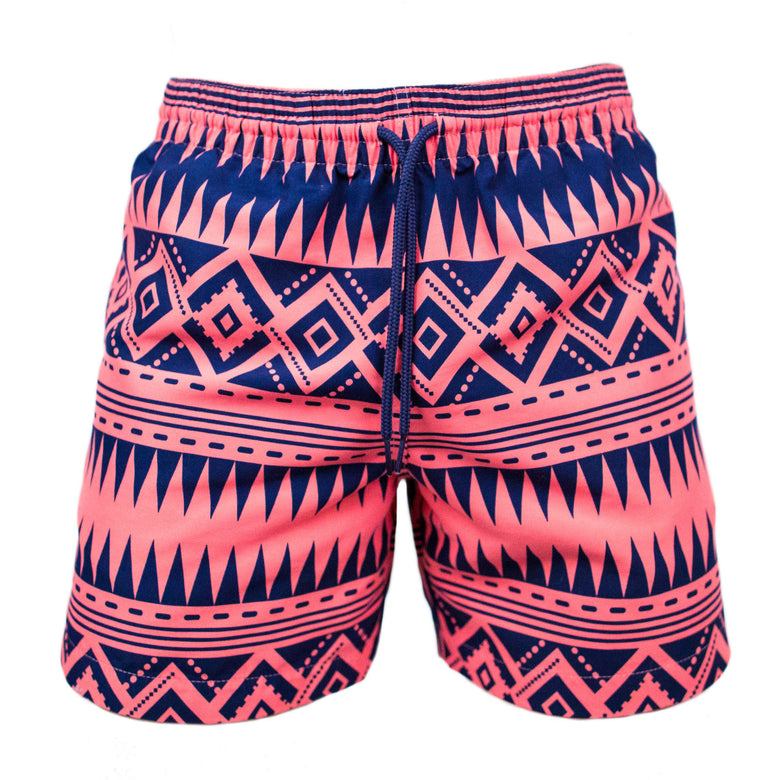 Materials: Made out of 100% Polyester. This is a pink trunk with a navy aztec pattern.
