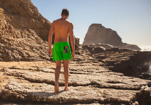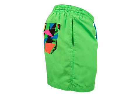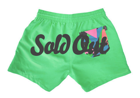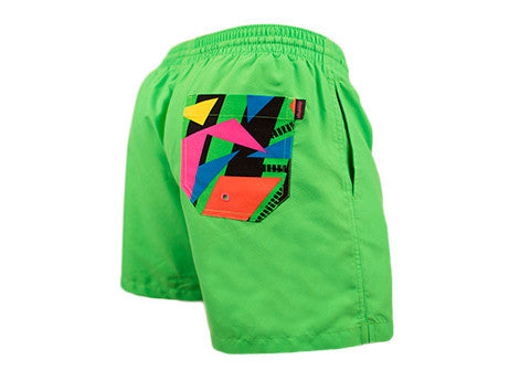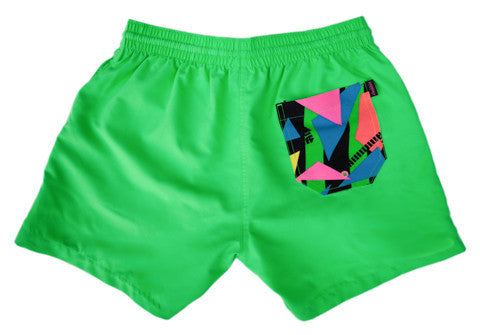 Materials: Made out of 100% Polyester. This is a neon green trunk and features a rad 90's print back pocket.