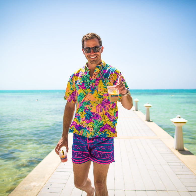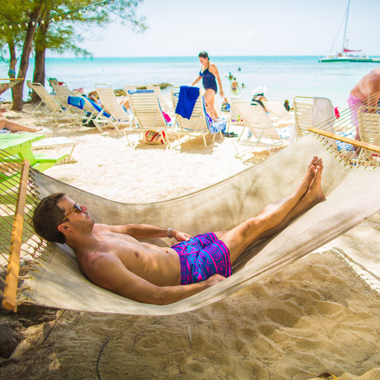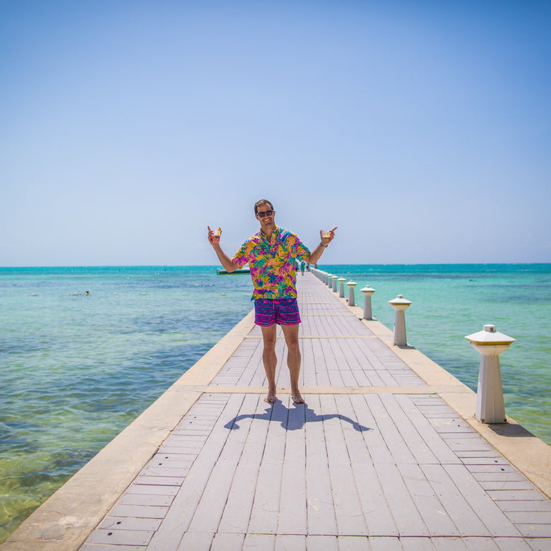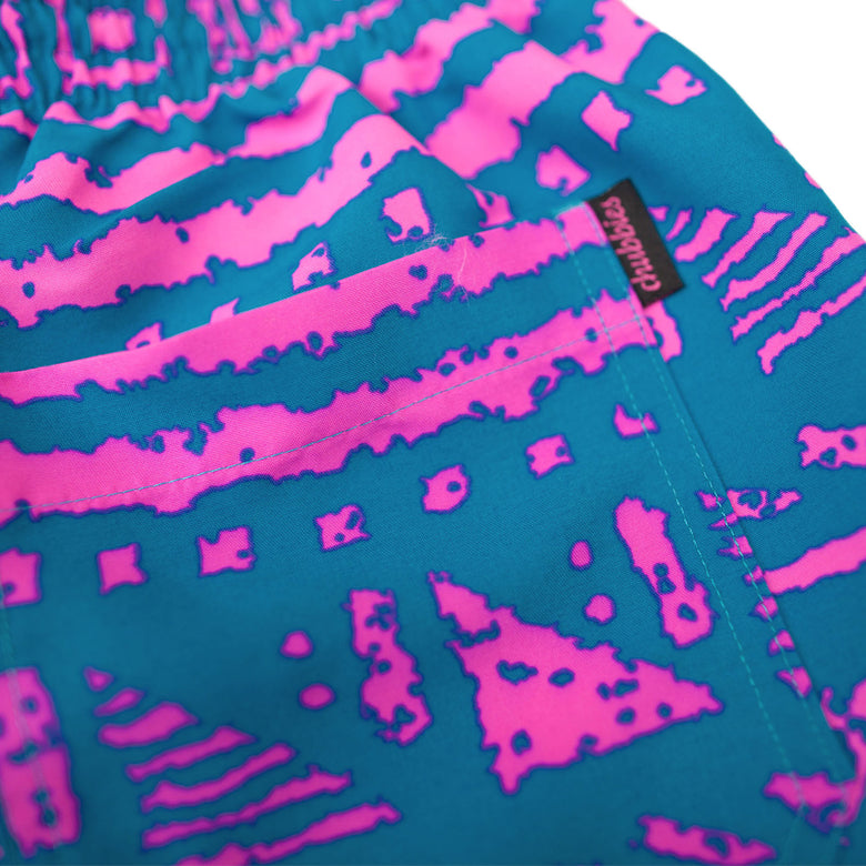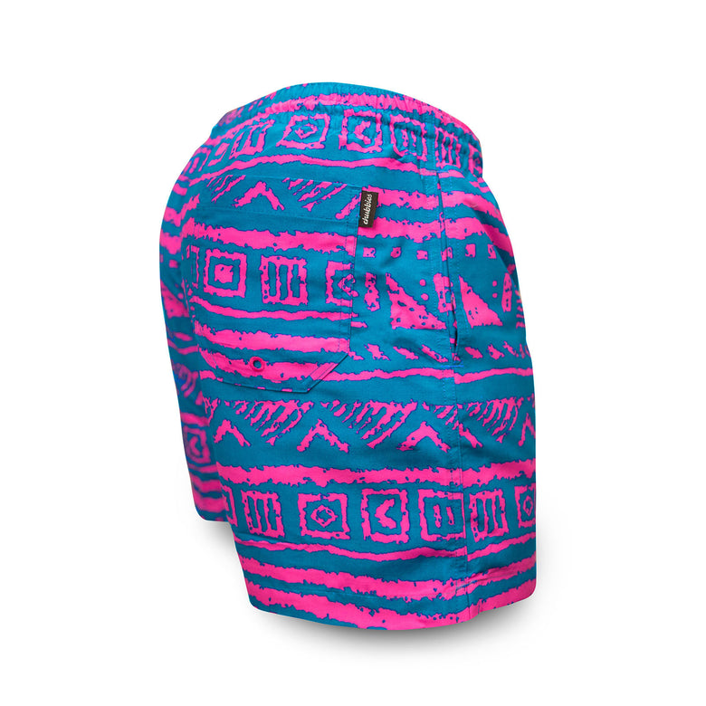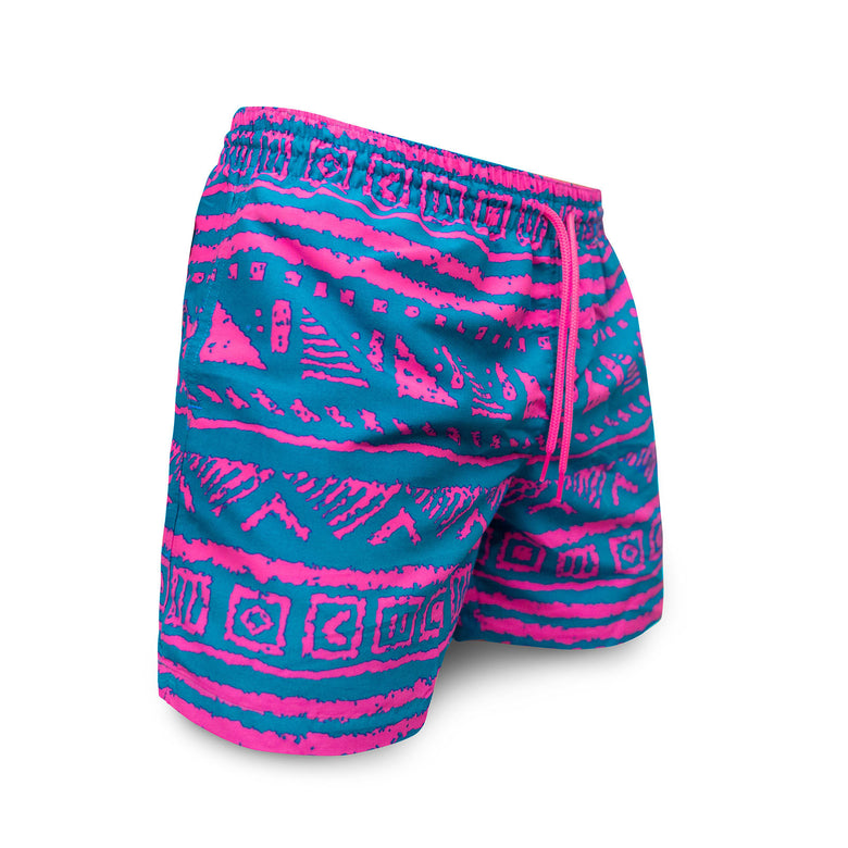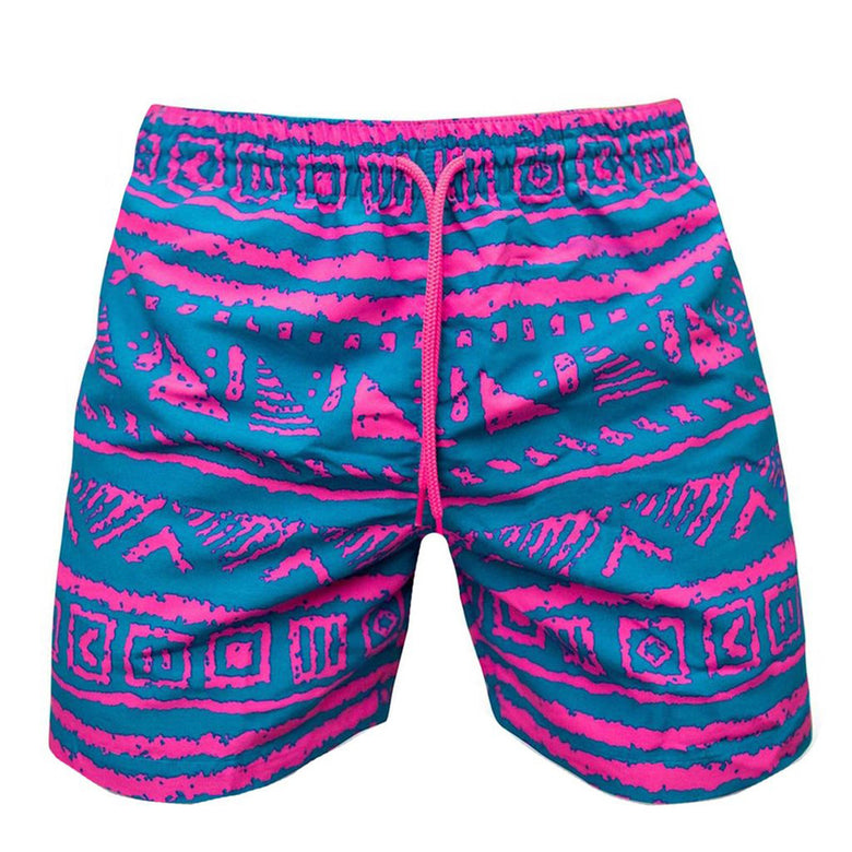 These trunks are blue with neon pink tribal print, and have been known to make it rain on command.
